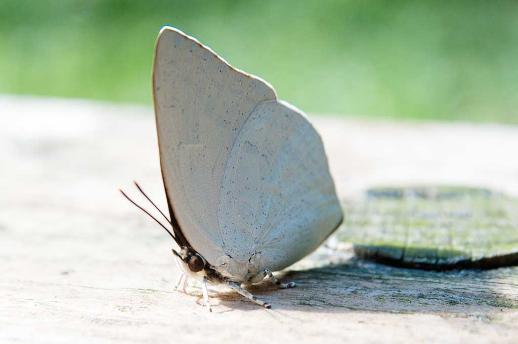 ウラギンシジミの食の好みは独特で、食を極めた玄人っぽい。花の蜜は吸わないし樹の蜜も吸わない。鳥や犬の糞に目がなく、たまに日陰の湿った土にも顔を寄せている。人間なら「食の達人」といわれそうだがこれは成チョウに限っての話。幼虫時代はクズの葉などを食草にする。