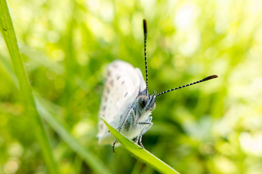 私のフィールドでは、ヤマトシジミは季節を問わず普通種なので、撮影チャンスはいくらでもある。しかし顔のアップを撮ろうとすると、これほど難しいチョウはない。吸蜜しているときですら落ち着きのない性質なので、簡単に顔の前にカメラを持っていけないし、体形が小さく顔は極小なので、撮ったとしてもピンボケがしょっちゅうだ。とはいえ解決手段は見つかるものだ。じつは産卵時期のメスの動きはゆっくりになるので、成功率は上がる。この写真はシャッタースピードを上げたために絞りが浅くなり、被写界震度も浅くなってしまった。ここまで姿がボケると生命感も薄れるが、使用カメラの感度特性が低く、これがベストの選択だった。